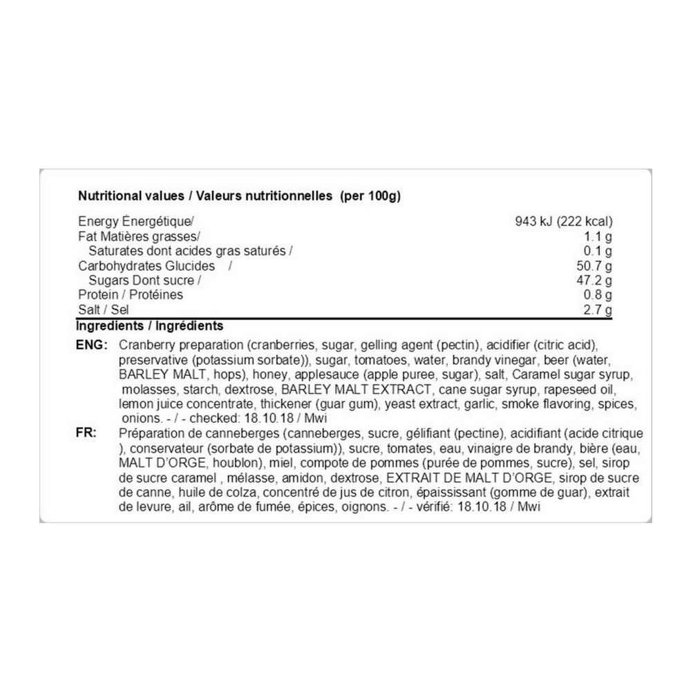Ingrediënten: Veenbessenbereiding (veenbessen, suiker, geleermiddel (pectine), zuurteregelaar (citroenzuur), conserveermiddel (kaliumsorbaat)), suiker, tomaten, water, brandewijnazijn, bier (water, GERSTEMOUT, hop), honing, appelmoes ( appelmoes, suiker), zout, Karamelsuikerstroop, melasse, zetmeel, dextrose, GERSTEMOUTEXTRACT, rietsuikerstroop, koolzaadolie, citroensapconcentraat, verdikkingsmiddel (guargom), gistextract, knoflook, rookaroma, specerijen, uien . - / - gecontroleerd: 18.10.18 / Mwi