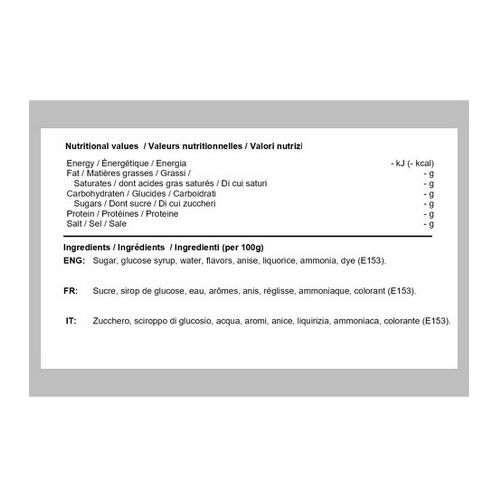 Ingrediënten: Suiker, glucosestroop, water, smaakstoffen, anijs, zoethout, ammoniak, kleurstof (E153).