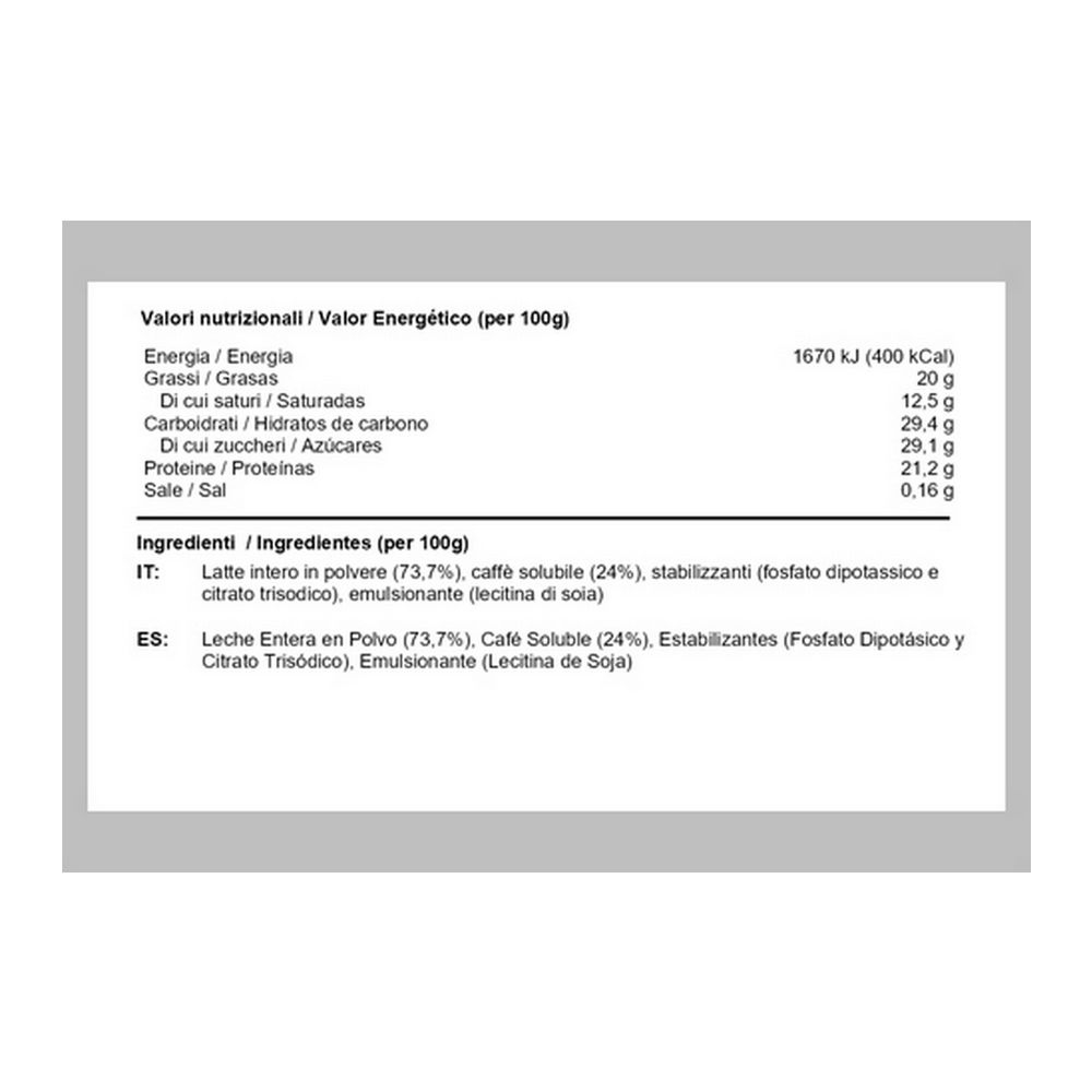 Ingrediënten: Volle melkpoeder (73,7%), instantkoffie (24%), stabilisatoren (dikaliumfosfaat, trinatriumcitraat), emulgator (sojalecithine).