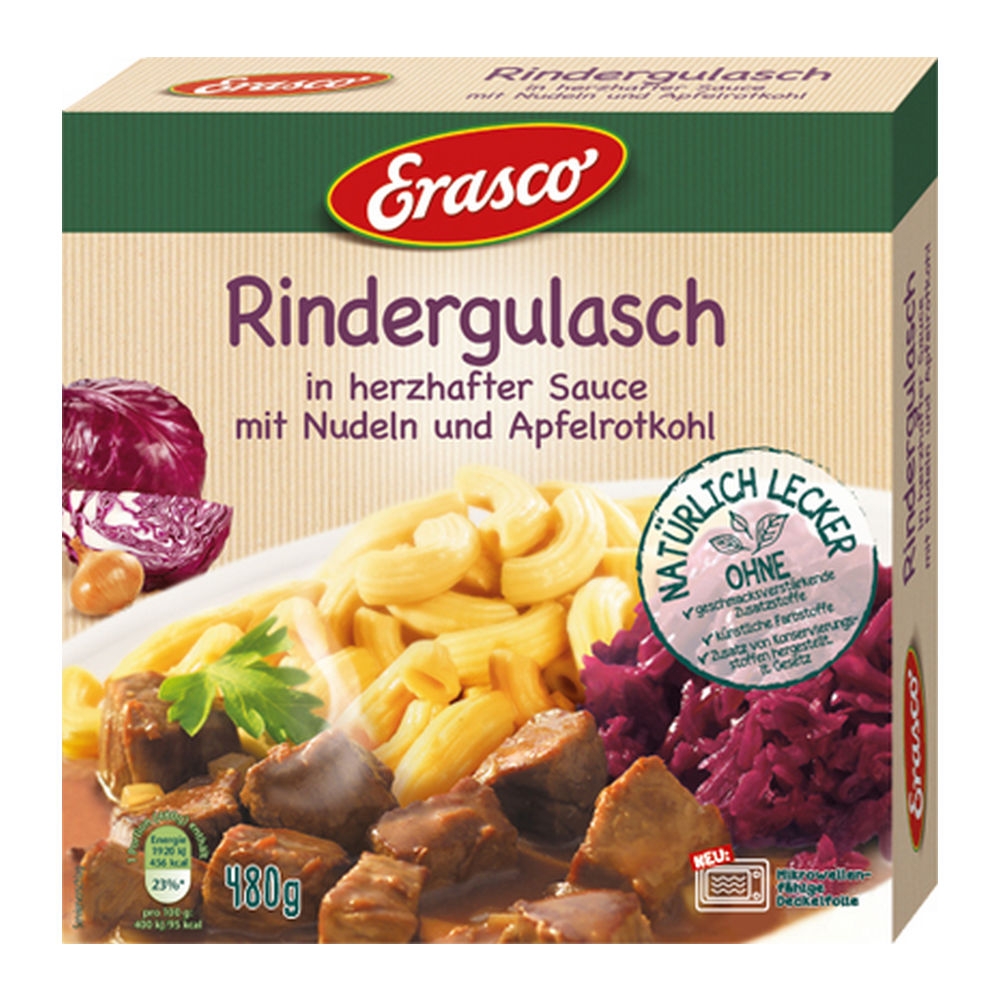 Rundvlees goulash in een hartige saus met rode kool en pasta. De Rundvlees goulash van Erasco biedt je een ambachtelijke, hartige traktatie met sappige runderblokjes in een pittige saus, samen met heerlijke rode kool en pasta met een fijn vleugje boter. We wensen je eet smakelijk!