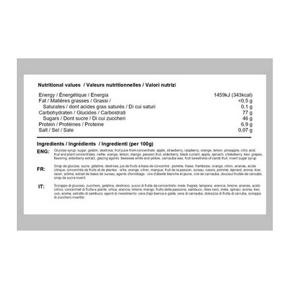 Ingrediënten: glucose siroop; Suiker; Gelatine; dextrose; Vruchtensap uit vruchtensapconcentraat: appel, aardbei, framboos, sinaasappel, citroen, ananas; zuurteregelaar: citroenzuur; Vruchten- en plantenconcentraten: saffloer, spirulina, appel, vlierbes, sinaasappel, zwarte bes, kiwi, citroen, aronia, mango, passievrucht, druif; Aroma; vlierbessenextract; Glansmiddel: bijenwas wit en geel, carnaubawas.