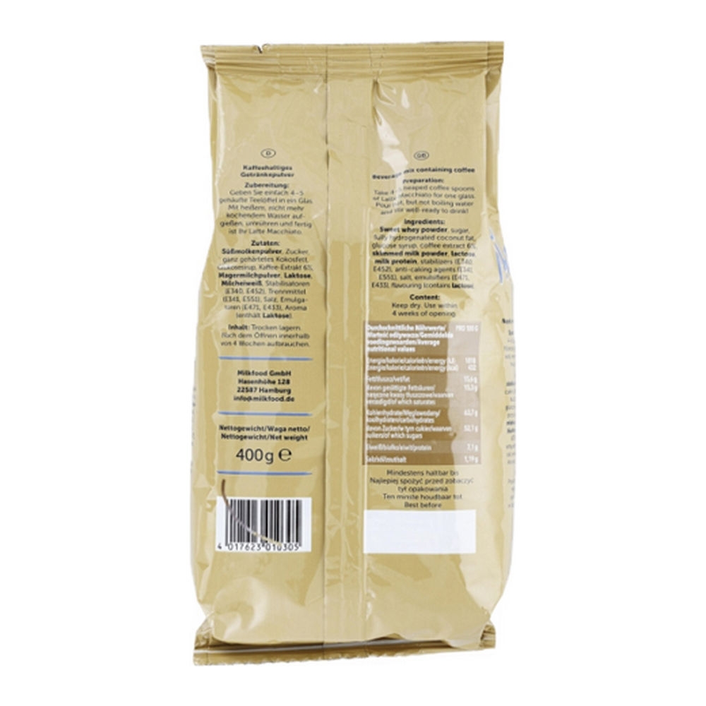 Met Milkfood latte macchiatio maakt u heerlijke latte macchiato in een hand omdraai! Eenvoudig een latte macchiato maken door 4-5 theelepels in een glas te doen. Hierna voegt u heet, niet meer kokend water toe, even roeren en klaar! Een heerlijke Latte Macchiato.