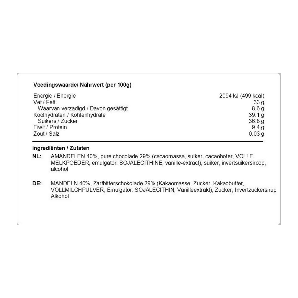 Ingrediënten: AMANDELEN 40%, pure chocolade 29% (cacaomassa, suiker, cacaoboter, VOLLE MELKPOEDER, emulgator: SOJALECITHINE, vanille-extract), suiker, invertsuikersiroop, alcohol
