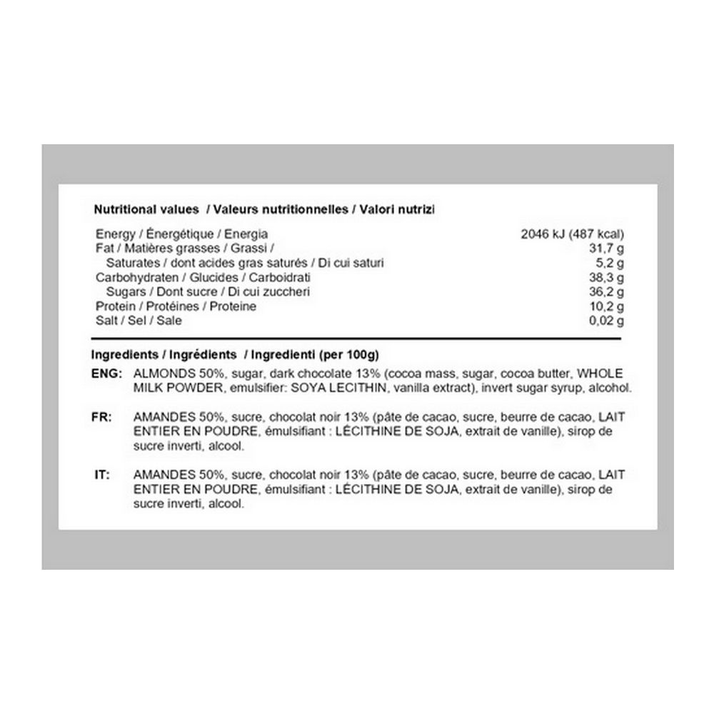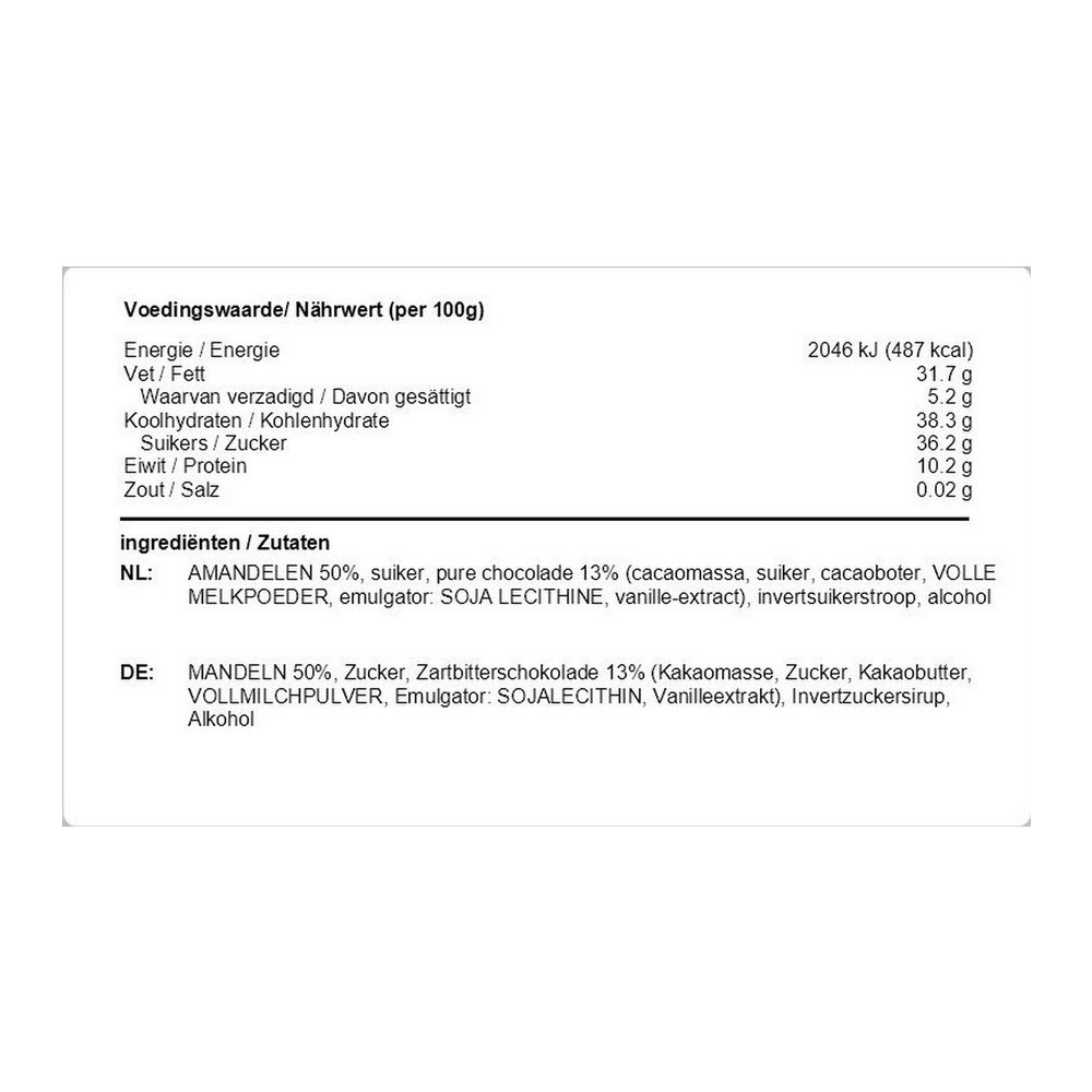 Ingrediënten: AMANDELEN 50%, suiker, pure chocolade 13% (cacaomassa, suiker, cacaoboter, VOLLE MELKPOEDER, emulgator: SOJA LECITHINE, vanille-extract), invertsuikerstroop, alcohol