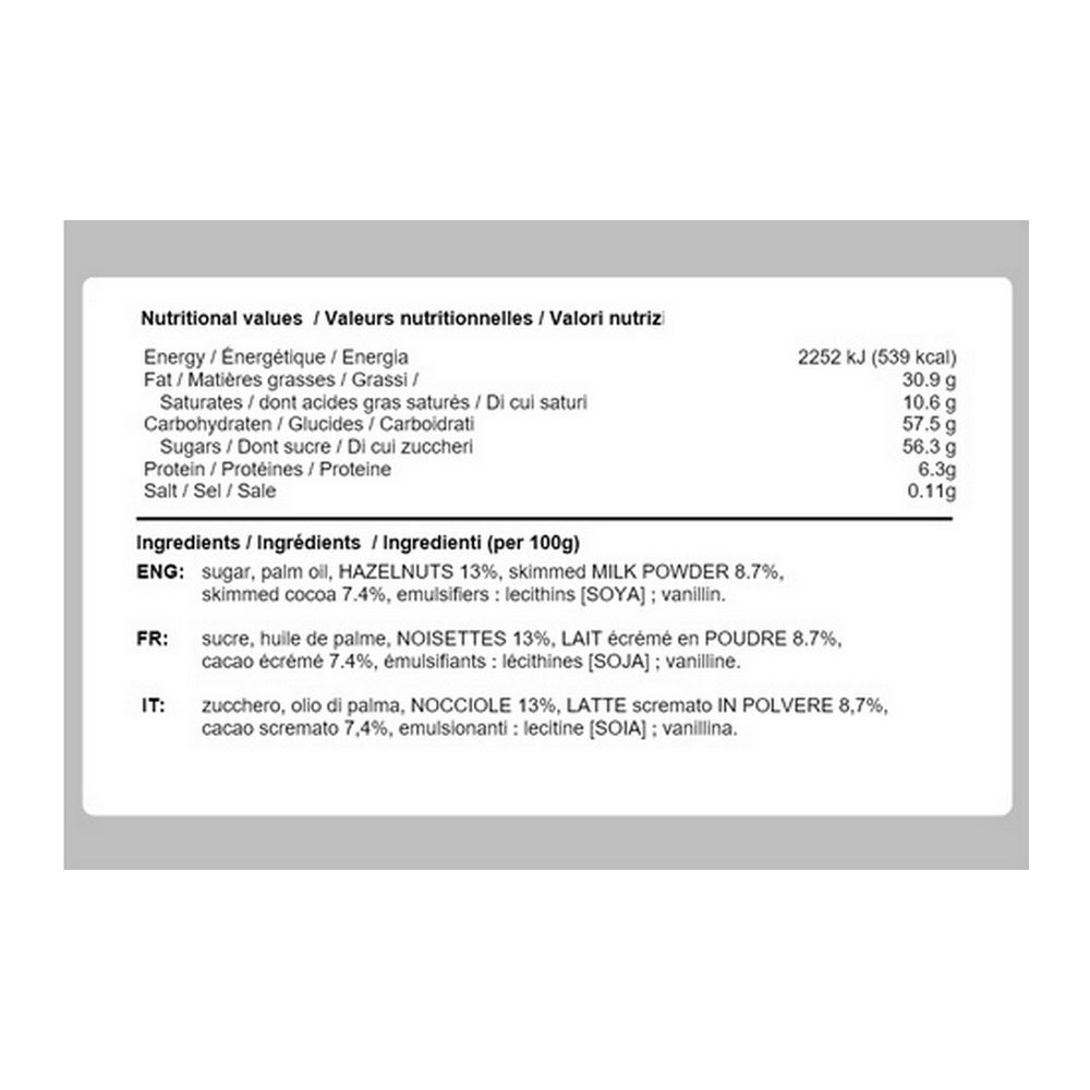 Ingrediënten: Suiker , palmolie , HAZELNOTEN 13%, magere cacao 7,4%, magere MELKPOEDER 6,6%, WEIPOEDER, emulgatoren: lecithinen [SOJA], vanilline Glutenvrij.