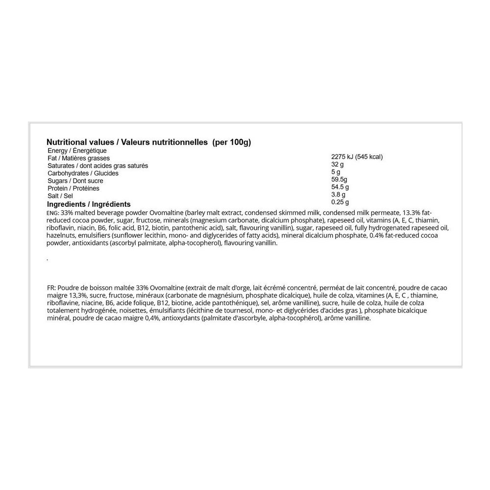 Ingrediënten: 33% mouthoudend drankpoeder * Ovomaltine [gerstemoutextract, gecondenseerde magere melk, gecondenseerd melkserum, magere cacaopoeder, suiker, fructose, mineralen (magnesiumcarbonaat, dicalciumfosfaat), koolzaadolie, vitamines (A, E, C, thiamine, riboflavine, B12, , Biotine, pantotheenzuur), keukenzout, aroma vanilline], suiker, koolzaadolie, volledig geharde koolzaadolie, hazelnoten, emulgatoren (zonnebloemlecithine, mono- en diglyceriden van vetzuren), mineraal dicalcium fosfaat, magere cacaopoeder, antioxidanten (ascorbyl aroma palocoferaat) Vanilline.