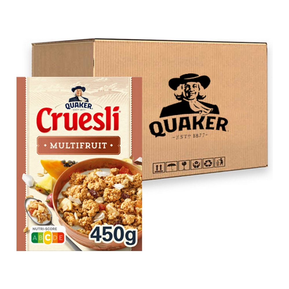 Quaker Cruesli Multifruit is een lekker knapperige granenmix met goudbruin geroosterde volkoren havermout en heerlijke gedroogde stukjes kokosnoot, banaan, rozijnen, papaya, ananas en appel.