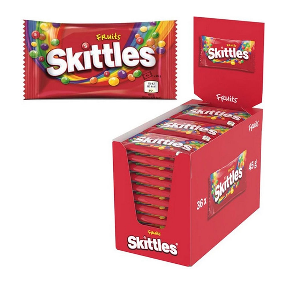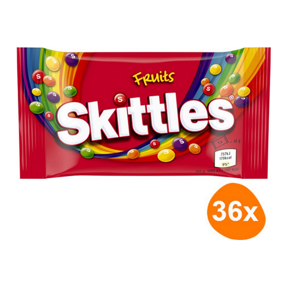 Skittles Fruits doosje 45g zijn kauwdragees in een knapperig suikerlaagje met fruitsmaken. Elk doosje bevat een vrolijke mix van snoepjes in alle kleuren van de regenboog. Dit product is glutenvrij (onder de 100 mg/kg). Skittles Fruits doosje 45g wordt geleverd in dozen van 16 stuks.